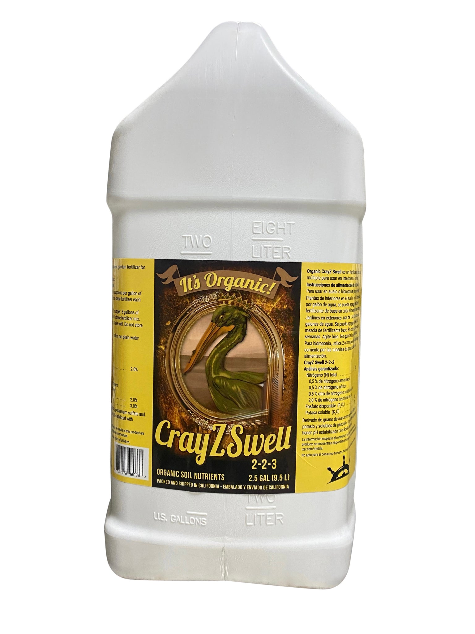 CrayZ Swell (2-2-3) is Mission Fertilizer's all purpose organic nutrient. It is a guano tea that is a three-times-concentrated super blend designed with blooms in mind. CrayZ Swell is an all purpose fertilizer for indoor or outdoor use in soil or drain to waste hydroponics.